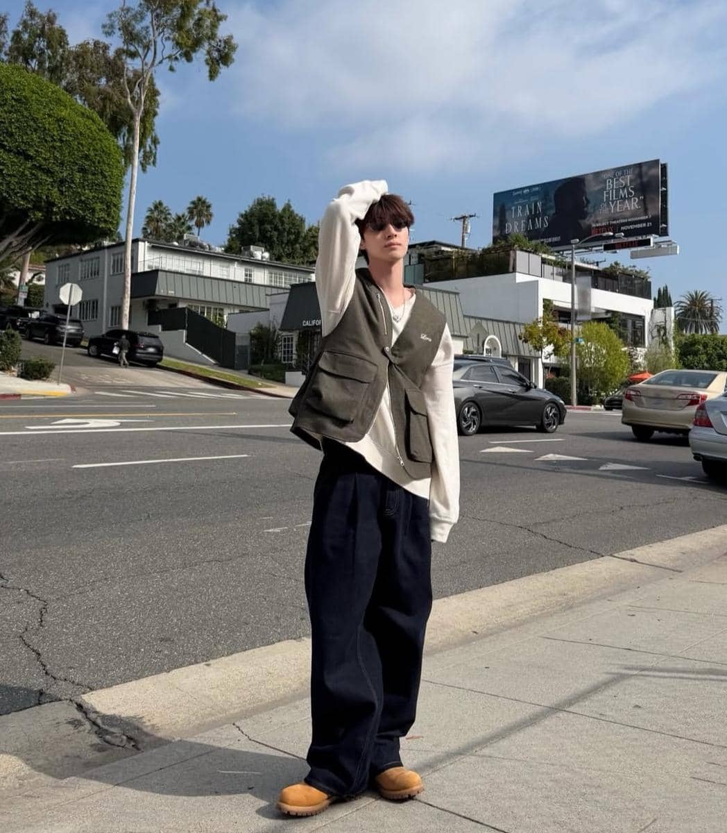 Vest cargo dengan lengan panjang dan celana wide leg, lengkap dengan Timberland boots. Layering yang sempurna, vibes urban outdoor yang keren abis!