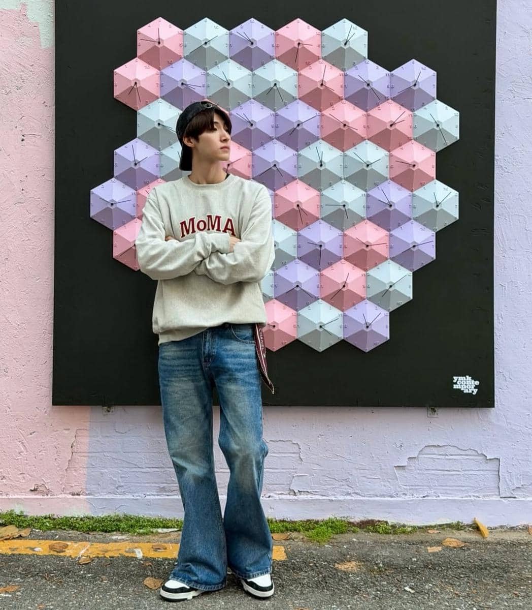 Sweatshirt cream, celana jeans wide leg, sneakers, dan topi. Vibe chill art-kid yang simpel tapi selalu hits!