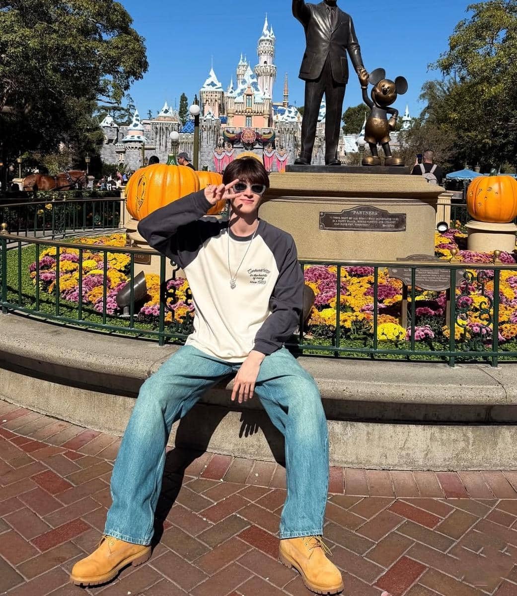 T-shirt raglan yang dipadukan dengan celana jeans wide leg, Timberland boots, serta kacamata. Gaya retro casual yang effortless, cocok untuk tampilan theme park!