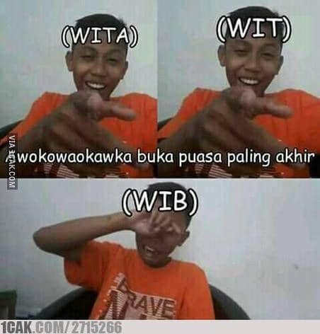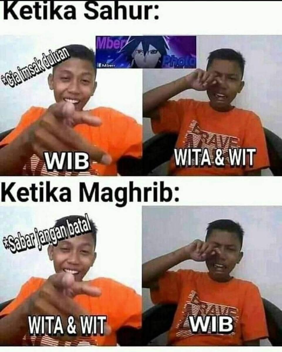 Meme pertama menunjukkan bahwa saat berbuka puasa di zona WIB (Waktu Indonesia Barat) terjadi paling akhir, namun saat sahur, WIB justru akan tertawa melihat WIT dan WITA yang sudah siap berbuka.