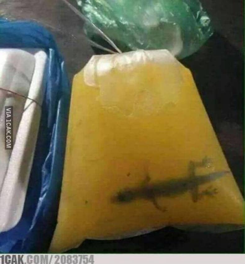 Pernahkah Anda merasa sedikit curiga ketika minum minuman? Jika iya, maka foto ini akan membuat Anda lebih waspada. Tampaknya, penjual takjil lupa melihat apakah ada cicak di dalam minumannya.