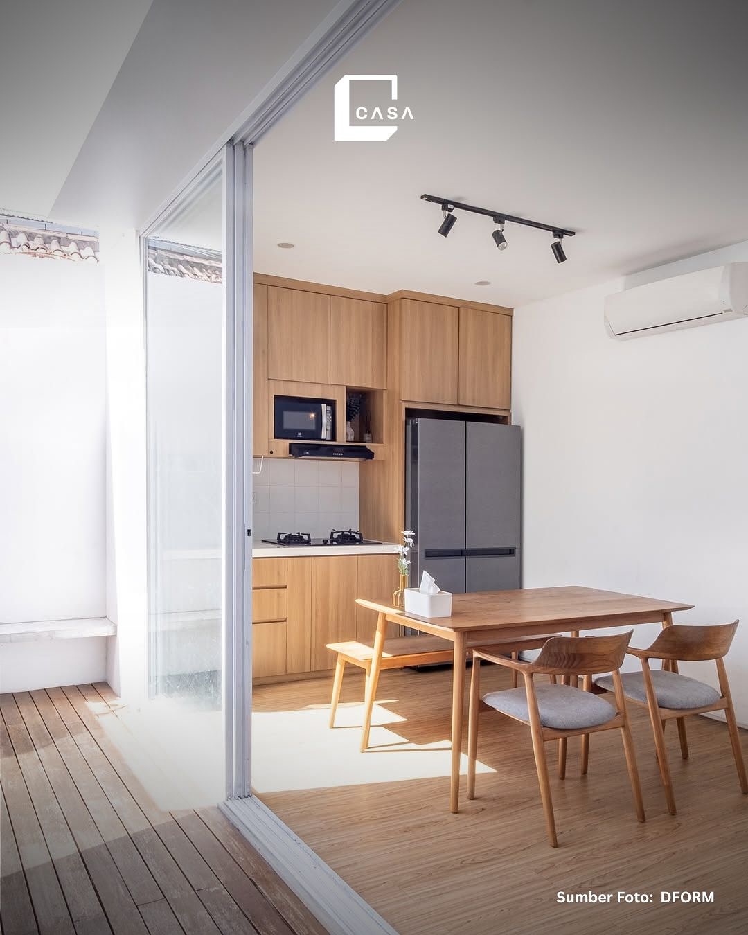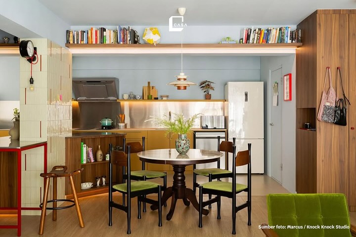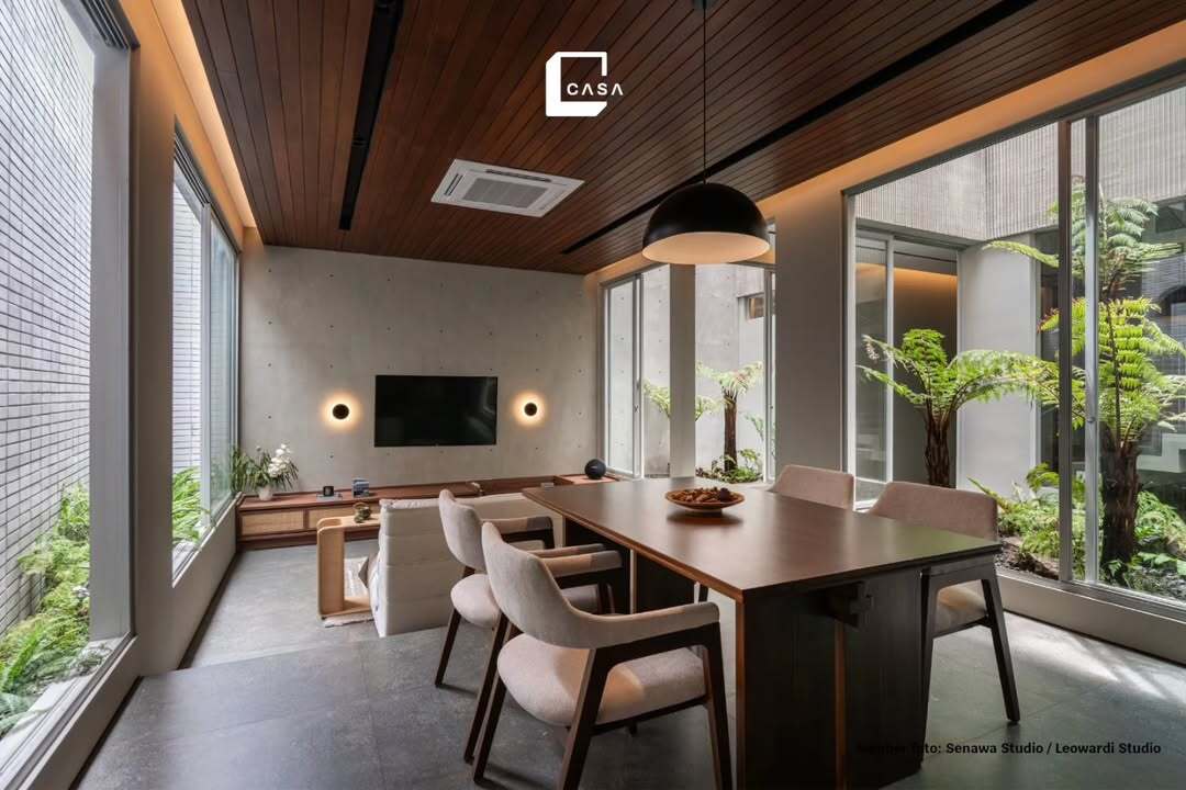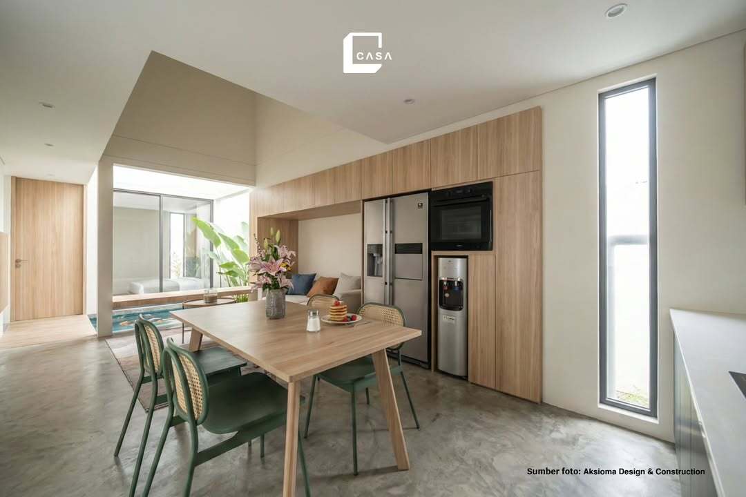 Meja makan ini dirancang multifungsi sebagai kitchen island. Selain untuk makan bersama, meja ini juga bisa digunakan sebagai area persiapan memasak. Desainnya yang memanjang dari material netral membuatnya terlihat modern dan bersih. Pencahayaan linear dan tanaman gantung menambah kesan segar dan hidup. -