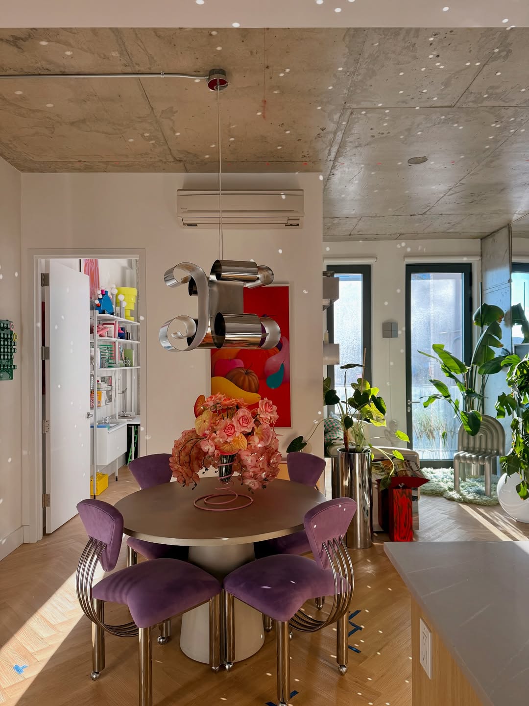 Meja makan ini menawarkan tampilan unik dengan kombinasi material dan palet warna cerah. Permukaan meja berfinishing metal dipadukan dengan kursi empuk berwarna ungu dan rangka metal. Kehadiran bunga berwarna pink menambah kesan hidup dan semarak.