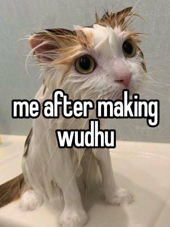 Ada kucing yang tampaknya sangat antusias saat mengambil wudhu. Hasilnya, tubuhnya basah kuyup, seperti baru saja menyebur ke bak mandi.