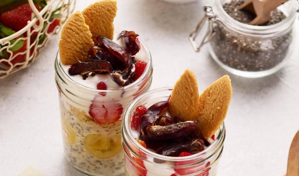 Menu ini cocok untuk kamu yang punya jadwal super padat. Overnight oats kurma praktis karena dibuat tanpa dimasak dan cukup didiamkan semalaman. Rasanya manis alami dengan tekstur lembut dan sedikit kenyal dari oat. Menu ini juga kaya serat dan bikin kenyang lebih lama. Cocok untuk sarapan sehat ala meal prep.
