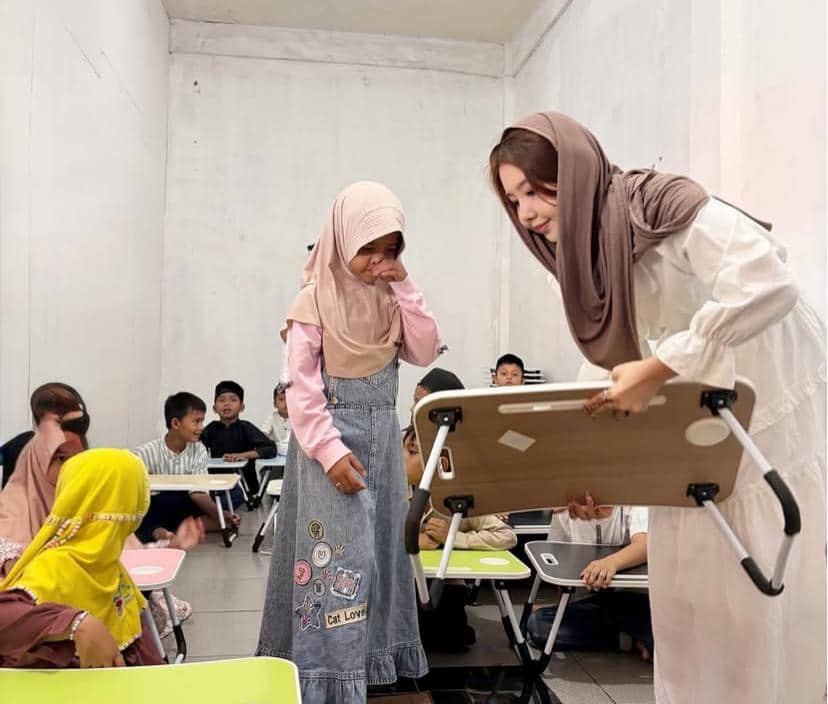 Tampil anggun dengan mengenakan kerudung, Vilmei tampak membangun interaksi yang hangat dengan para murid.
