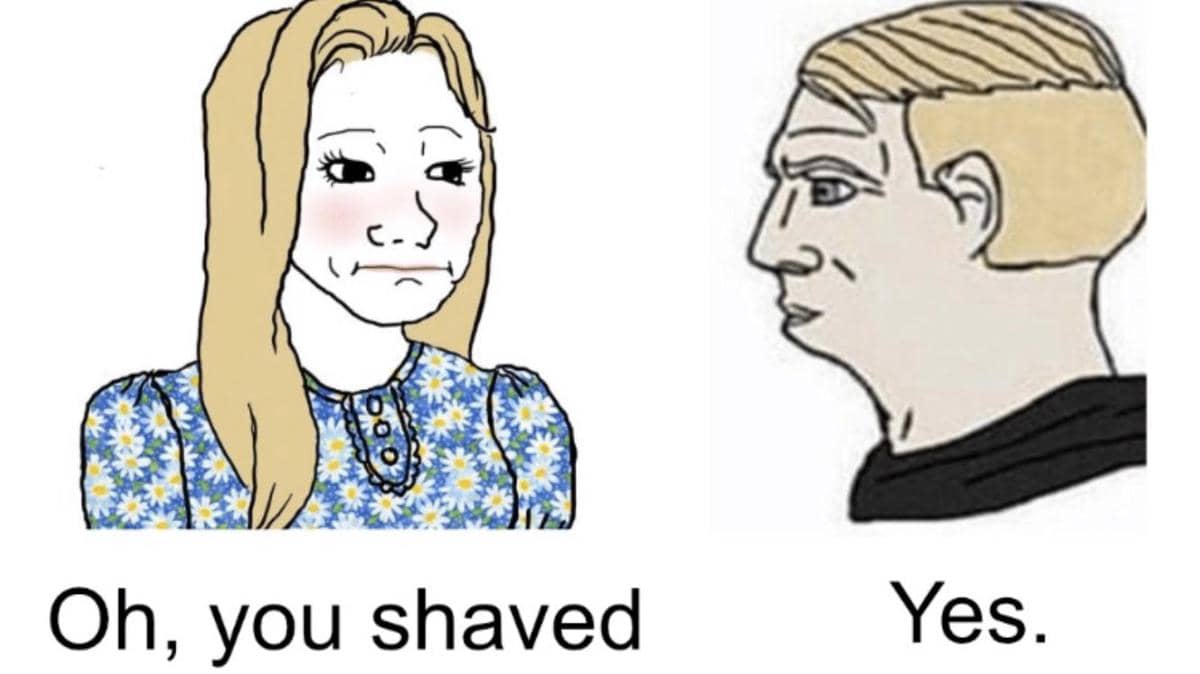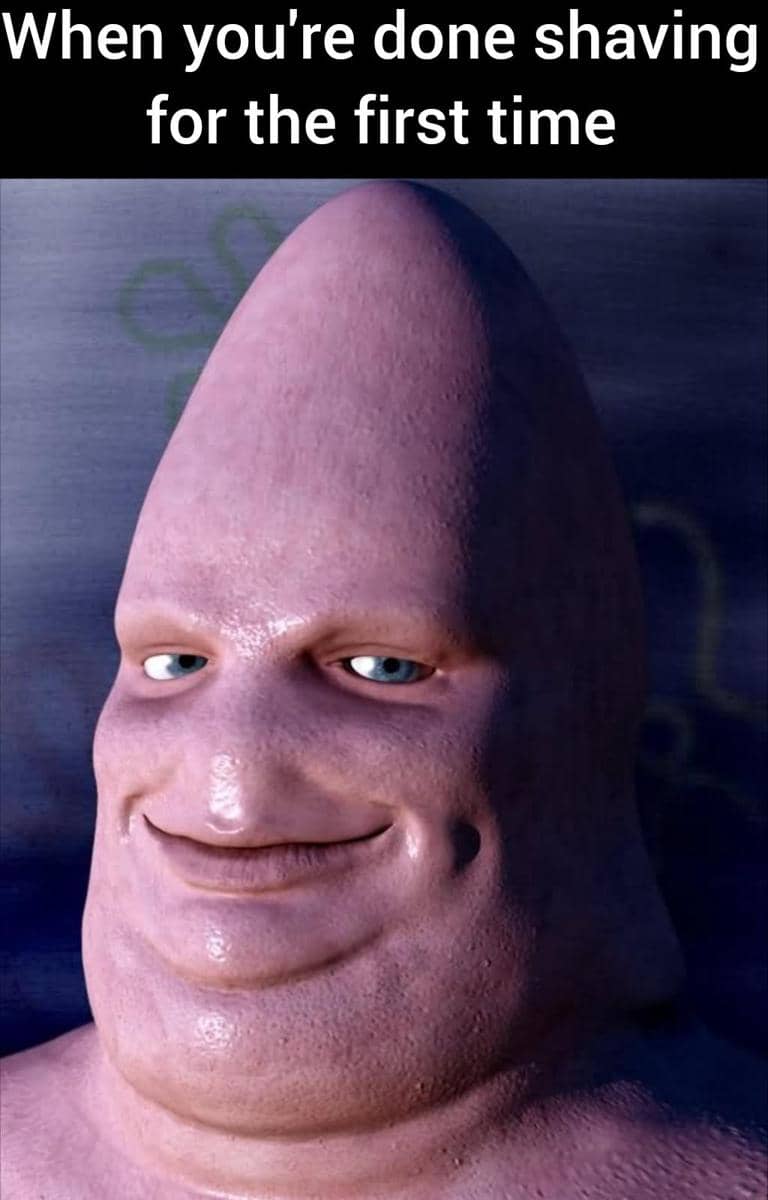 Dalam meme ini, wajah seseorang tampak lebih bersih setelah dicukur, tetapi ekspresi wajahnya terlihat sedikit aneh. Mungkin karena efek dari perubahan tiba-tiba pada bentuk wajah. -