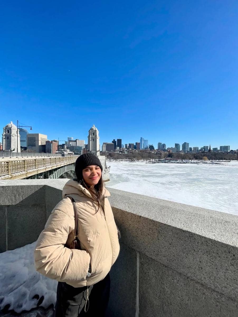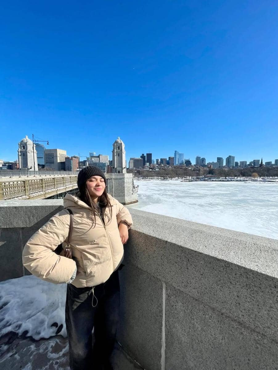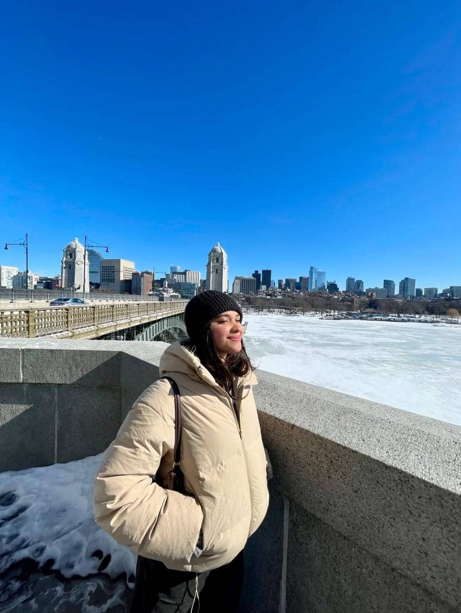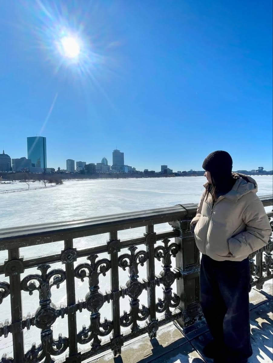 Aurora Ribero menikmati liburan musim dingin di Boston dengan berjalan-jalan di tepi sungai tersebut