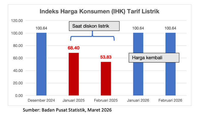 Pada bulan Januari dan Februari 2026, tarif listrik sudah kembali normal, sehingga indeks harga konsumen tarif listrik stabil dan tidak memberikan andil inflasi terhadap inflasi bulanan untuk Februari 2026. “Kebijakan diskon listrik yang diterapkan pada Januari dan Februari 2025 membuat level harga lebih rendah dibandingkan kondisi normal. Namun, kebijakan tersebut tidak berlaku pada Januari dan Februari 2026, sehingga harga kembali normal,” jelas Amalia.