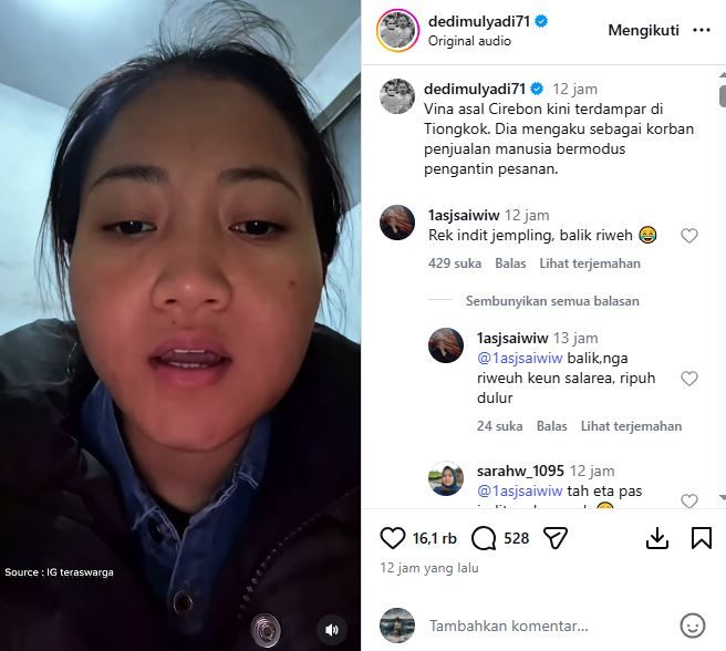 Dedi Mulyadi siap membantu Vina Cirebon yang mengaku menjadi korban TPPO dengan modus pengantin pesanan di Tiongkok, netizen ramai memberikan komentar. Banyak dari mereka menyentil sosok Vina tersebut.