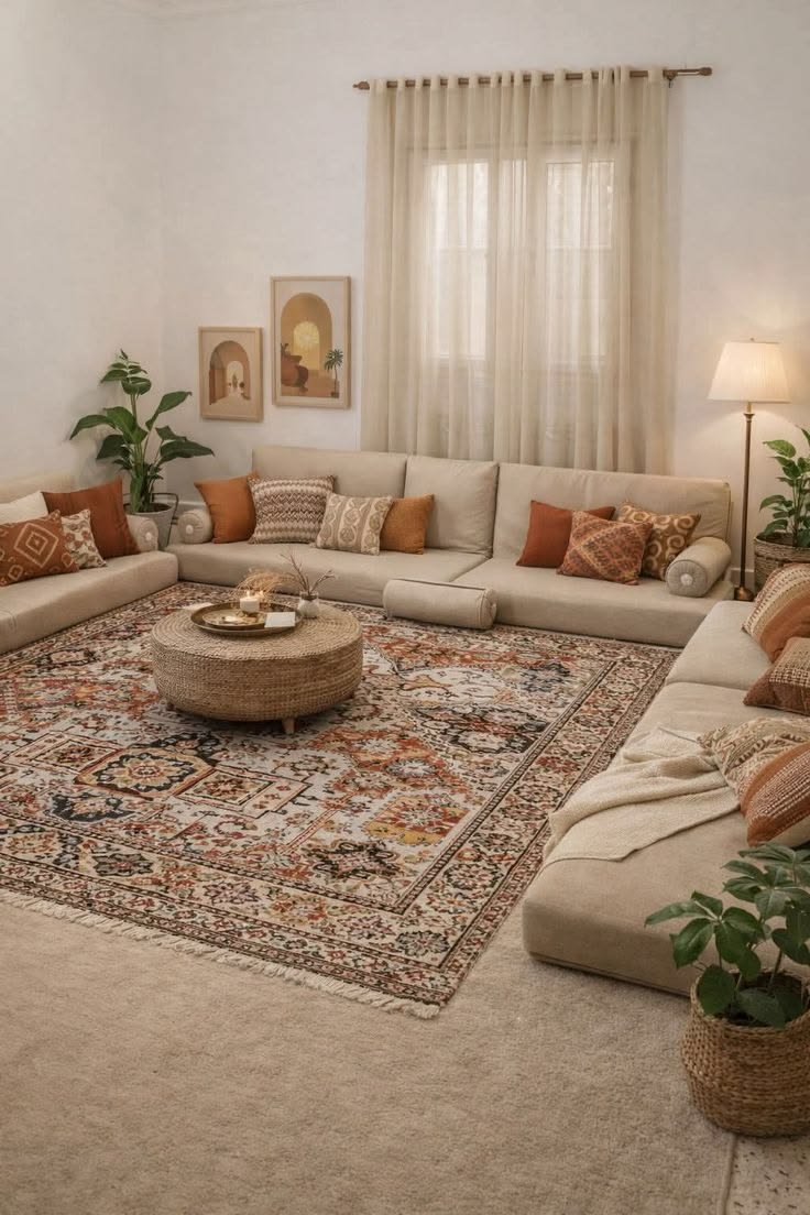Karpet membantu menghangatkan suasana sekaligus membuat ruang terasa lebih intim. Pilih karpet dengan warna netral atau motif lembut agar tetap selaras dengan keseluruhan desain ruang tamu. -