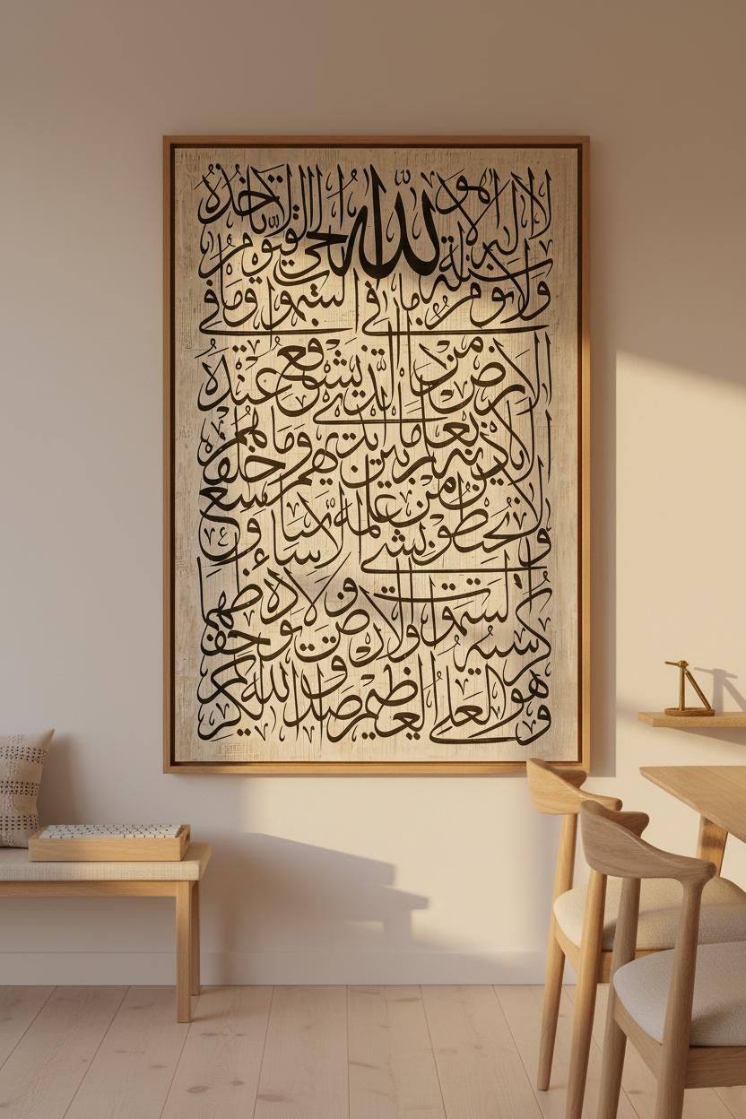 Tambahkan dekorasi dinding bernuansa religius atau karya seni dengan tone lembut. Tidak perlu berlebihan, cukup satu titik fokus yang memberi karakter pada ruang. -