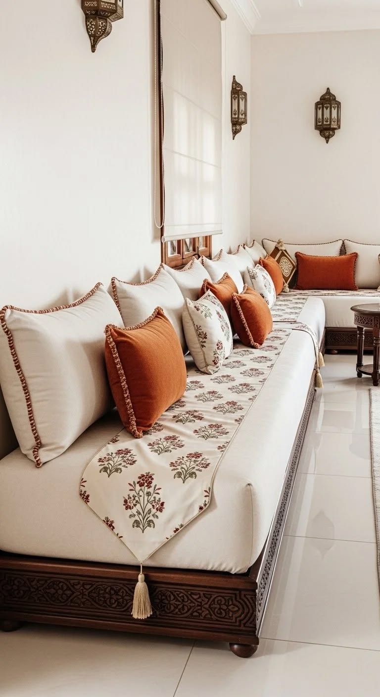 Ganti sarung bantal dengan motif atau warna yang lebih segar. Sentuhan hijau sage, emas lembut, atau motif geometris islami dapat memberi suasana berbeda tanpa perlu mengganti furnitur utama. -