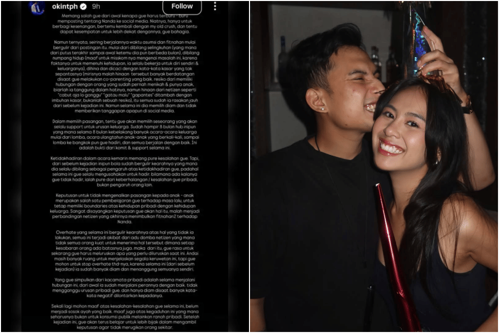 Melalui Instagram Story pada Senin (23-2-2026), Okin mengakui kesalahannya karena terlalu cepat memublikasikan hubungan dengan Nanda. Ia mengatakan keputusan tersebut memicu asumsi dan fitnah yang berkembang di publik.