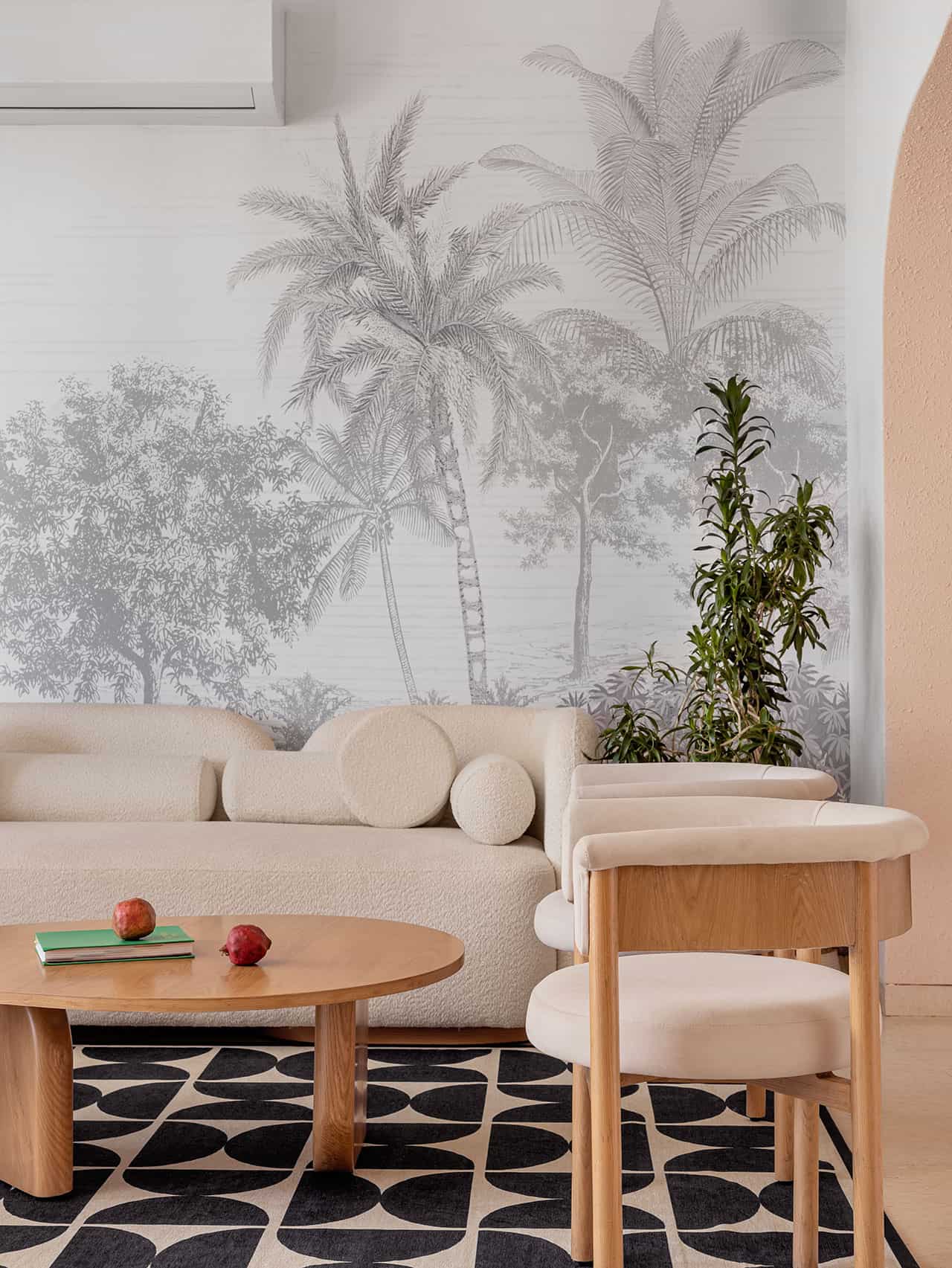 Di ruang tamu dan ruang makan, wallpaper tropis dan sofa bouclé berwarna off-white menghadirkan nuansa coastal yang ringan. Meja kopi dengan bentuk organik ditempatkan di atas karpet hitam-beige untuk menyeimbangkan komposisi ruang. Area makan dilengkapi meja marmer putih dan kabinet konsol dari kombinasi oak dan cane, menciptakan perpaduan antara elegan dan rustic.