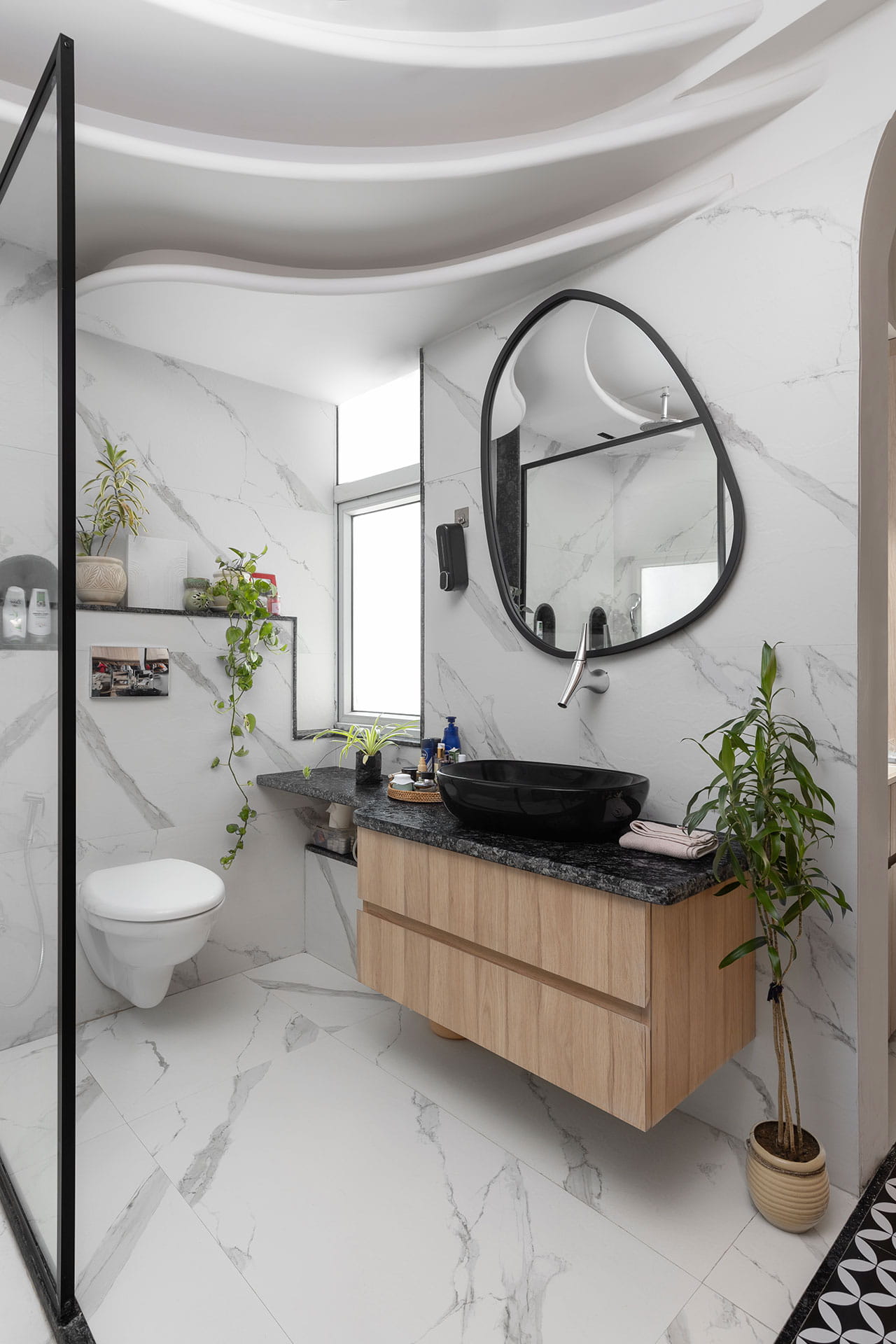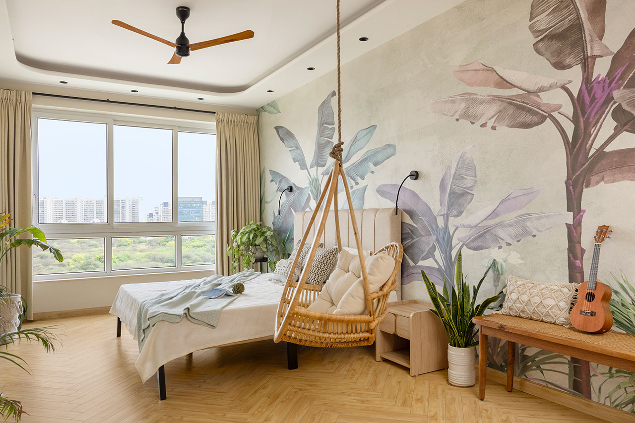 Di kamar tidur utama, ayunan kecil di samping tempat tidur menghadirkan suasana santai seperti vila liburan. Wallpaper tropis memberi sentuhan playful Boho pada palet warna netral. Kamar mandi terhubung dirancang dengan ubin monokrom dan lengkungan lembut, menonjolkan bentuk kurva dibanding sudut tajam. Pendekatan ini menjaga kesinambungan visual sekaligus menciptakan suasana spa yang menenangkan.