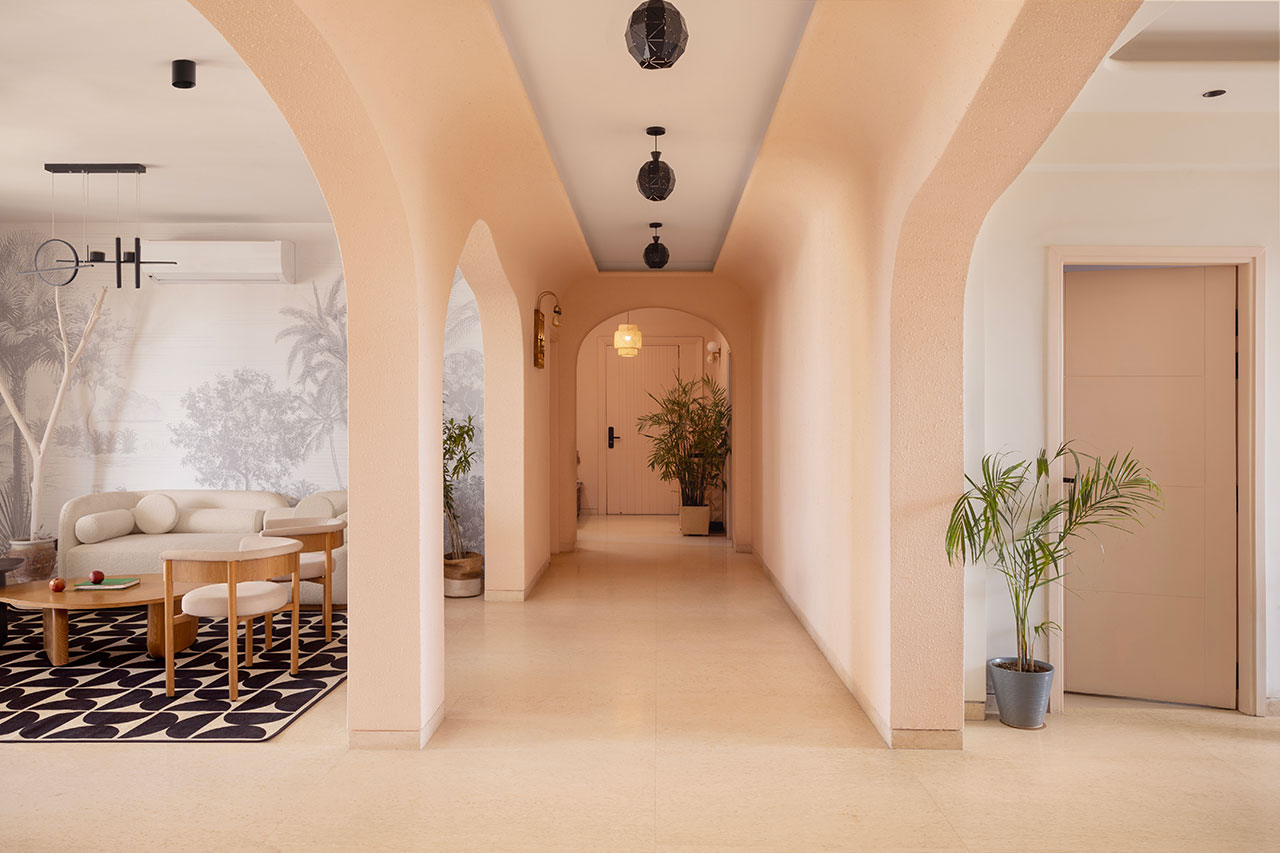 Desainer Aanchal Antal dan Ranjan Prajapati menghadapi tantangan utama dalam menyatukan kedua gaya tersebut. Alih-alih menggunakan panel dinding, mereka memanfaatkan siluet furnitur, veneer kayu alami, serta tekstil lembut untuk mendefinisikan ruang. Material seperti kayu oak, anyaman cane, dan kain bouclé berpadu dengan warna pastel serta cahaya alami yang masuk melalui jendela besar apartemen.