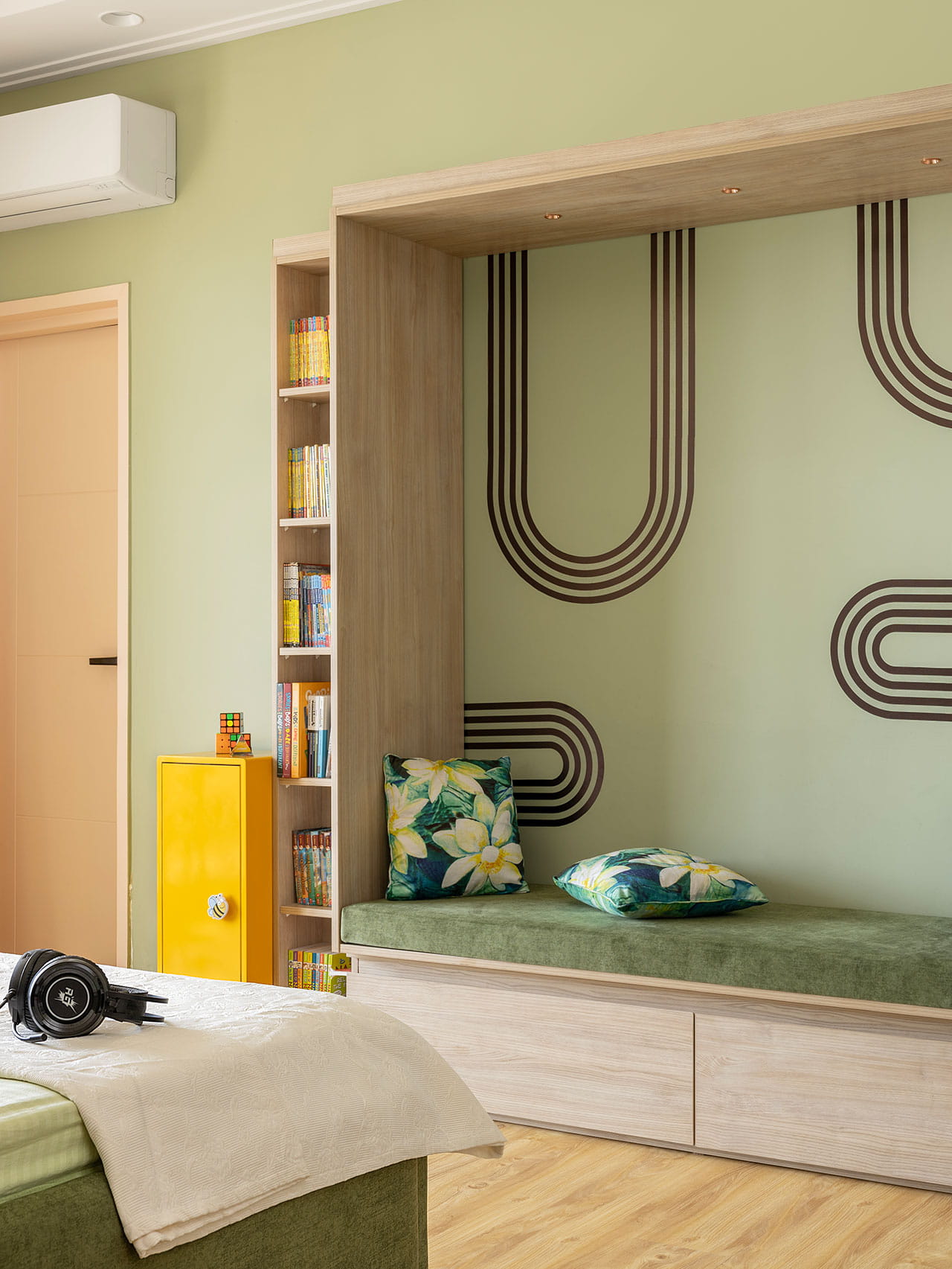 Kamar anak dirancang dengan nuansa playful namun tetap sophisticated. Tempat tidur berlapis kain hijau olive lembut dilengkapi headboard fluted yang unik. Custome wallpaper menghadirkan karakter whimsical yang dapat beradaptasi seiring pertumbuhan anak. Sebagai elemen interaktif, dipasang jungle gym bar gantung di dalam kamar yang dapat digunakan untuk bermain dan beraktivitas. Elemen ini menjadikan ruang tidur sebagai area eksplorasi kreatif yang menyenangkan sekaligus fungsional.