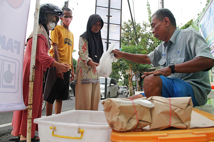“Saya memberi makan semata-mata mengharap rida Allah SWT,” ujarnya. Pria yang kesehariannya bekerja sebagai wiraswasta itu menjelaskan, biasanya masyarakat memilih membawa pulang nasi bungkus tersebut. Namun, ada juga yang memilih berbuka di tempat. Pria 59 tahun itu juga menyediakan piring, meja, dan kursi bagi masyarakat yang memilih berbuka di tempat.