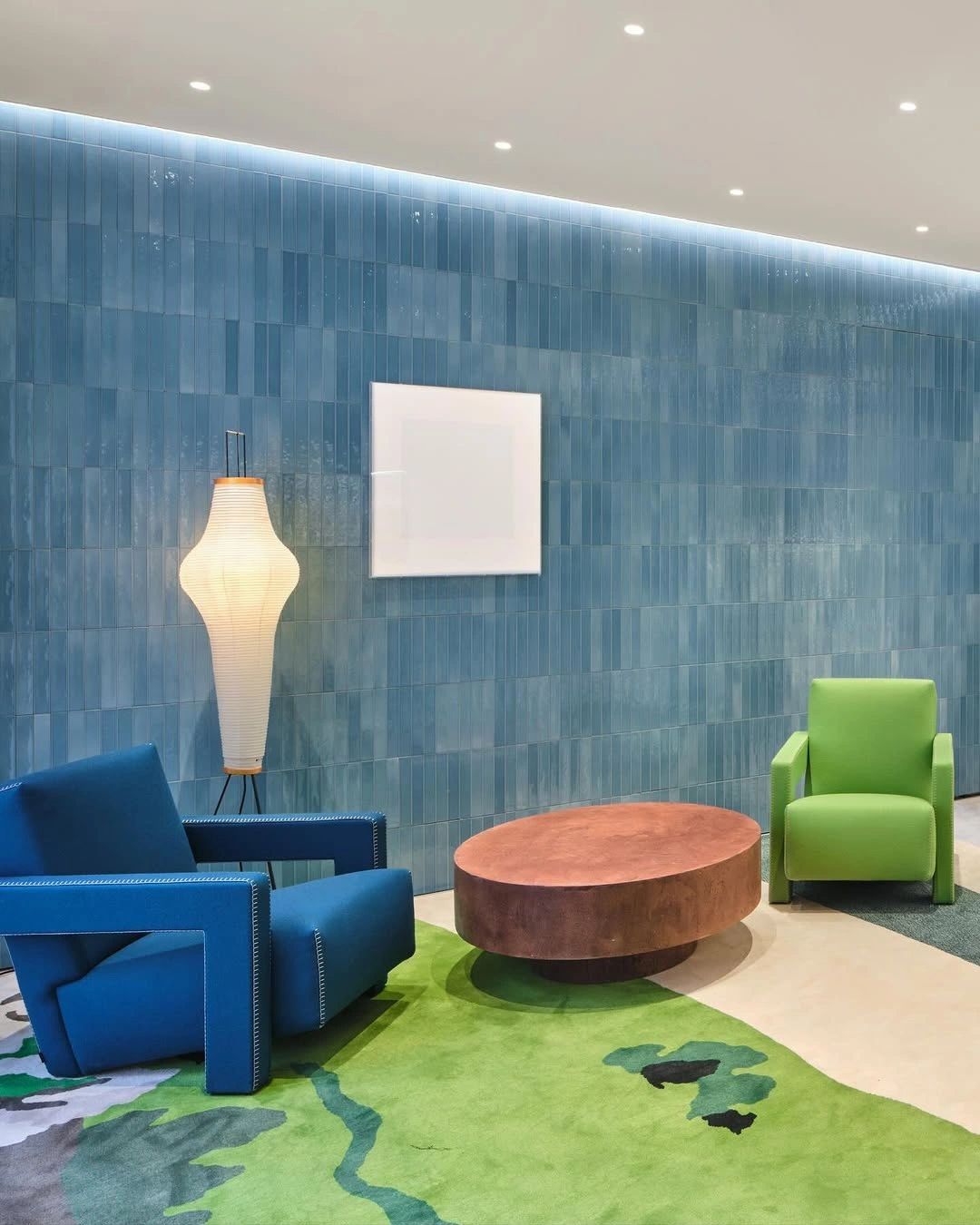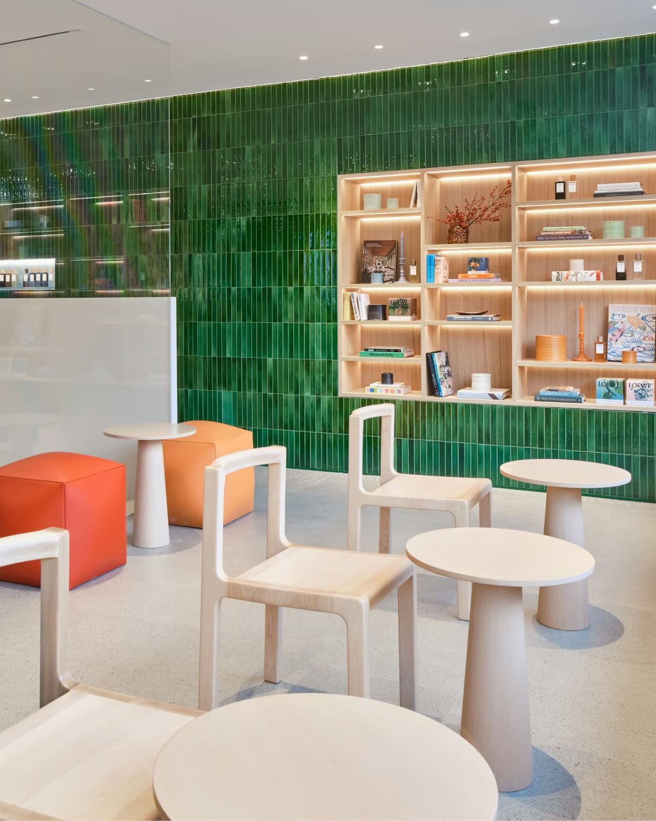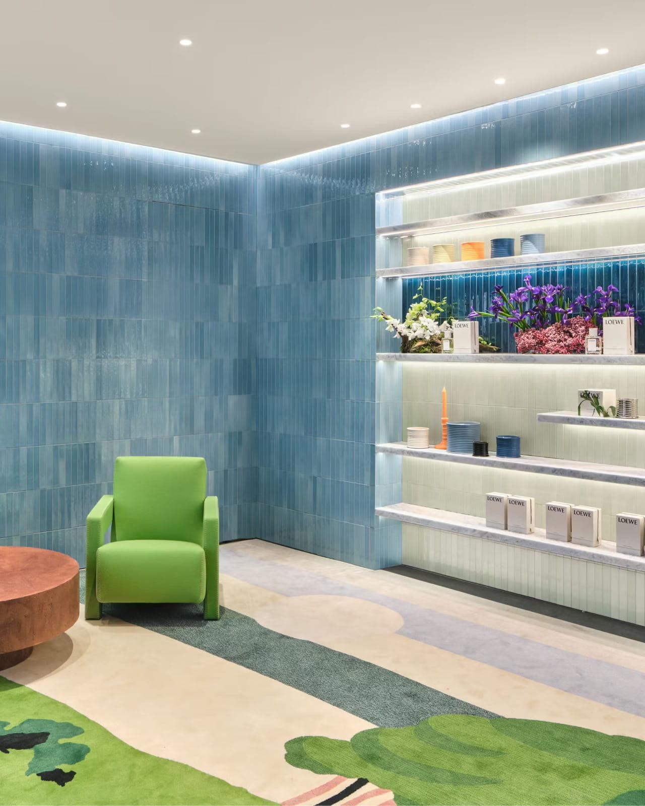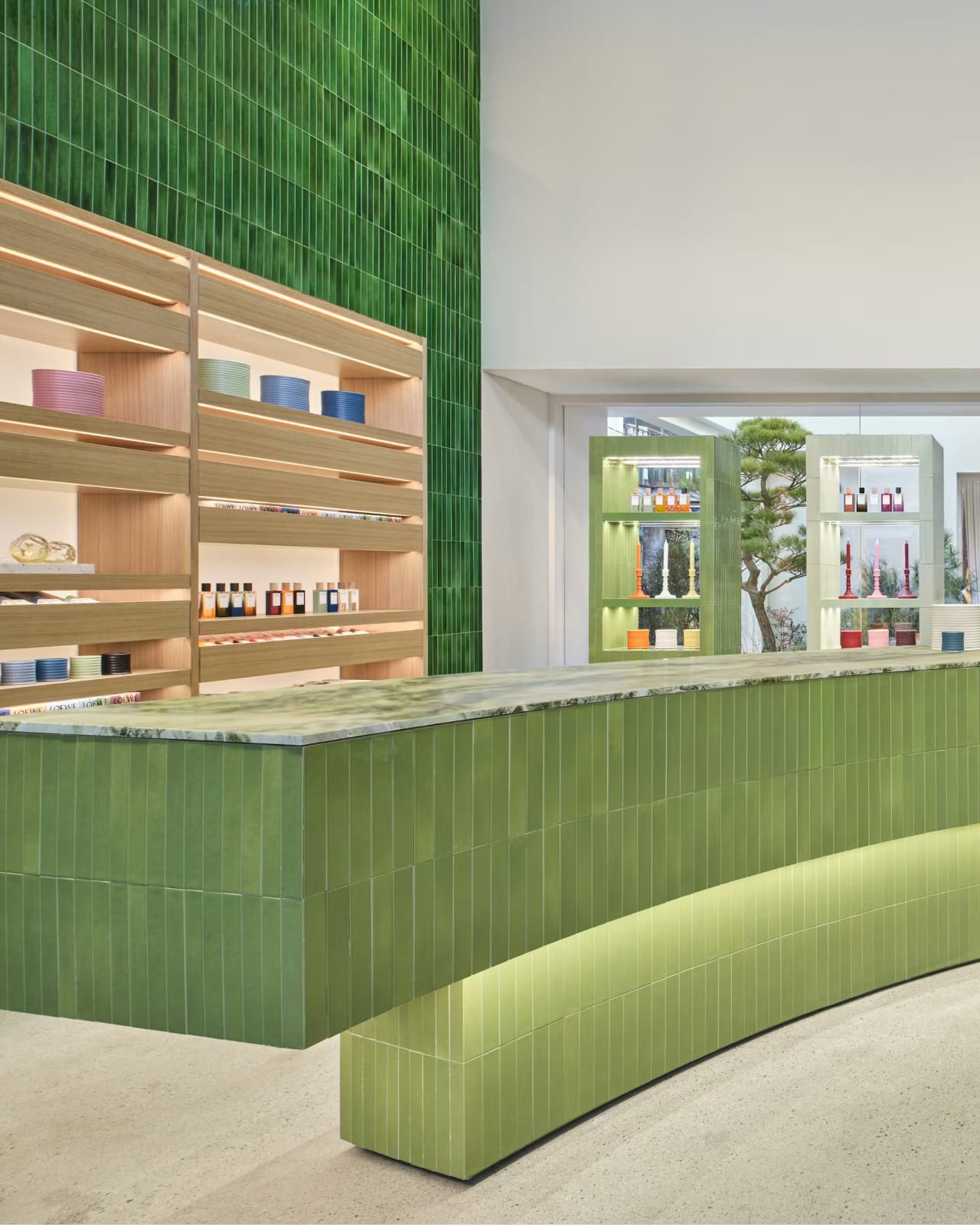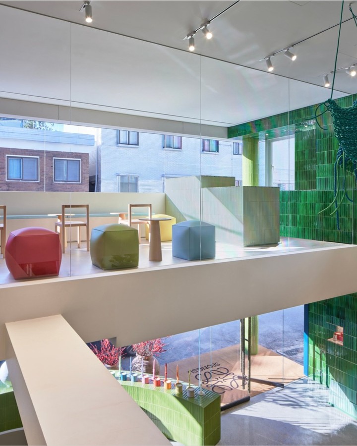 Desain arsitektur toko mengambil inspirasi dari dunia botani, memadukan identitas Spanyol khas Loewe dengan referensi desain Korea. Fasad dan interior dilapisi ubin keramik handmade berwarna teal blue, emerald, lime green, hingga turquoise yang menciptakan karakter visual kuat sekaligus menenangkan.
