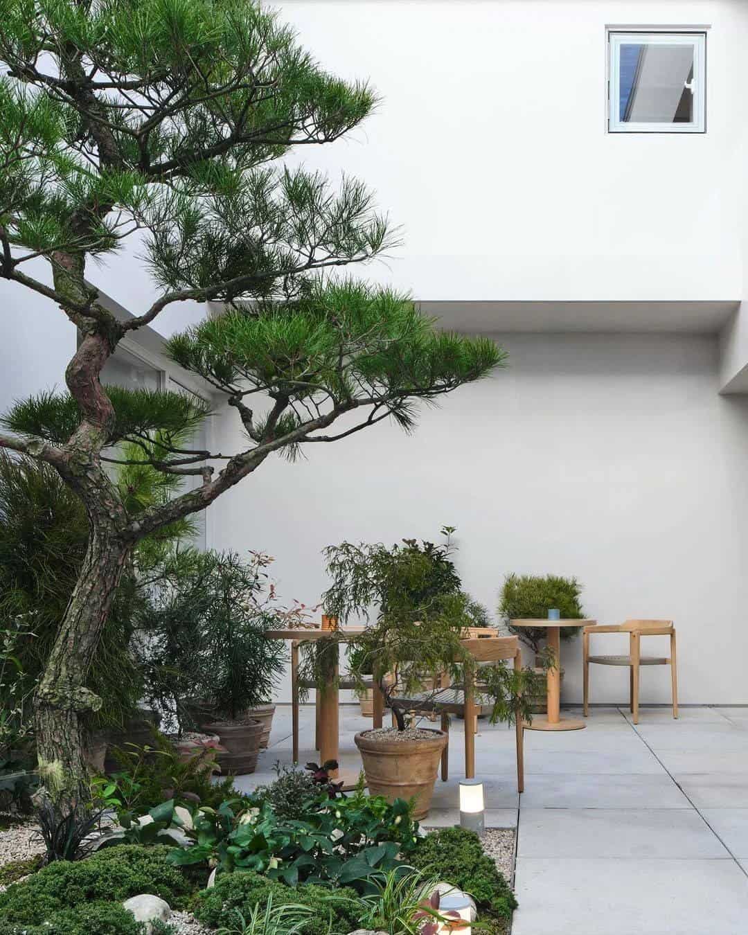 Sebuah taman menjadi elemen utama ruang, terinspirasi dari tipologi rumah tradisional Korea. Adanya pohon pinus dan pot keramik menghadirkan dialog antara lanskap Asia Timur dan warisan Mediterania Spanyol.