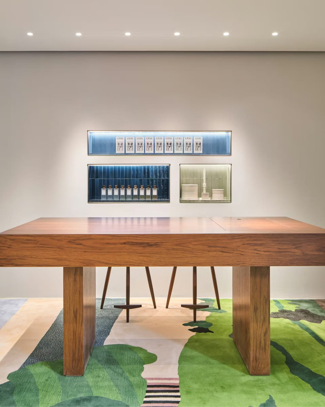 Di dalamnya, pengunjung dapat menemukan seluruh lini Loewe Perfumes, termasuk Crafted Collection, Botanical Rainbow, Un Paseo por Madrid, serta rangkaian Home Scents dan Bath line. Area khusus juga disediakan untuk menghadirkan pengalaman ritual perawatan tubuh, memungkinkan pengunjung merasakan produk secara lebih personal dan imersif.