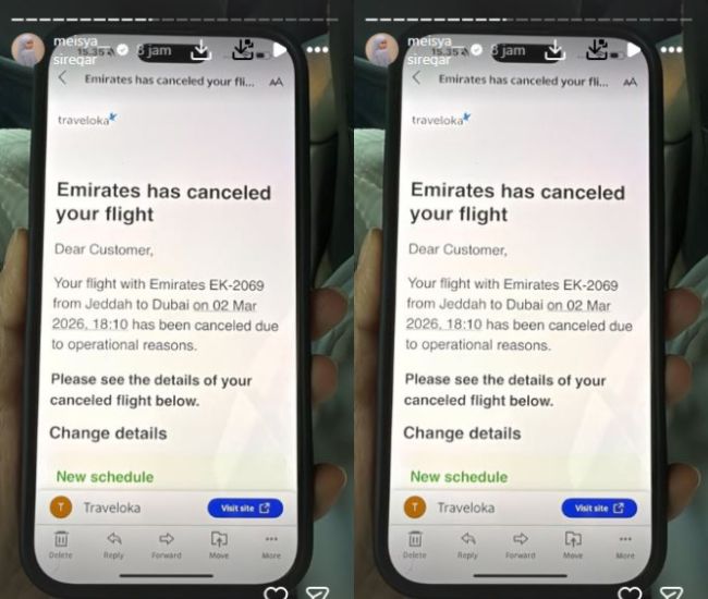Melalui Instagram story, Meisya juga membagikan tangkapan layar pemberitahuan penerbangan yang dibatalkan. Dalam pemberitahuan tersebut tertulis bahwa penerbangan Emirates EK-2069 dari Jeddah ke Dubai pada tanggal 02 Maret 2026 pukul 18.10 telah dibatalkan karena alasan operasional.
