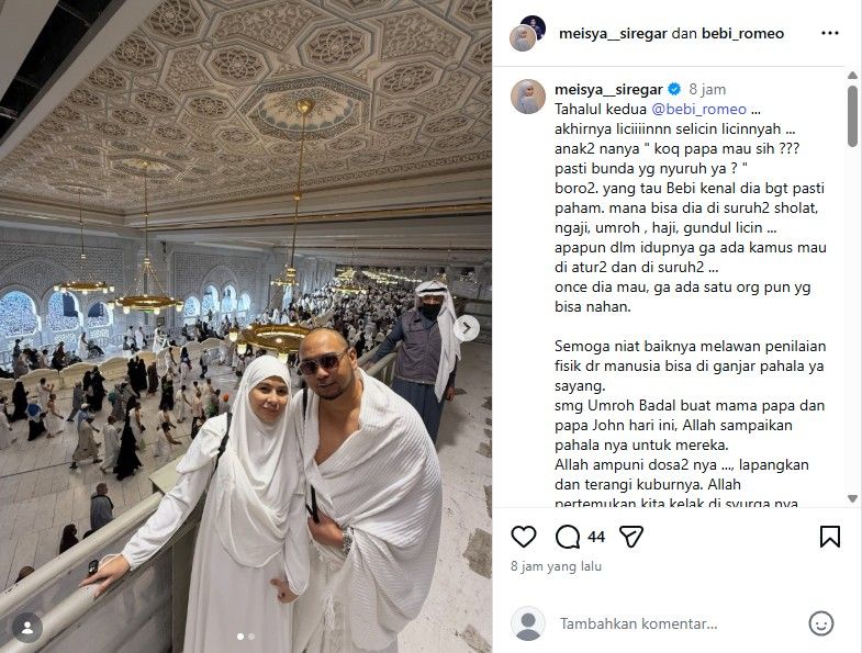 Meisya Siregar melalui unggahan Instagram @meisya_siregar membagikan foto dirinya dan suaminya, Bebi Romeo, saat berada di Tanah Suci. Selain itu, ia juga memberikan informasi terkini tentang kondisi keduanya. Salah satu hal yang menarik perhatian adalah foto Bebi Romeo yang akhirnya mau bercukur gundul. Meisya berharap niat baik suaminya tersebut akan mendapatkan pahala dan kebaikan.