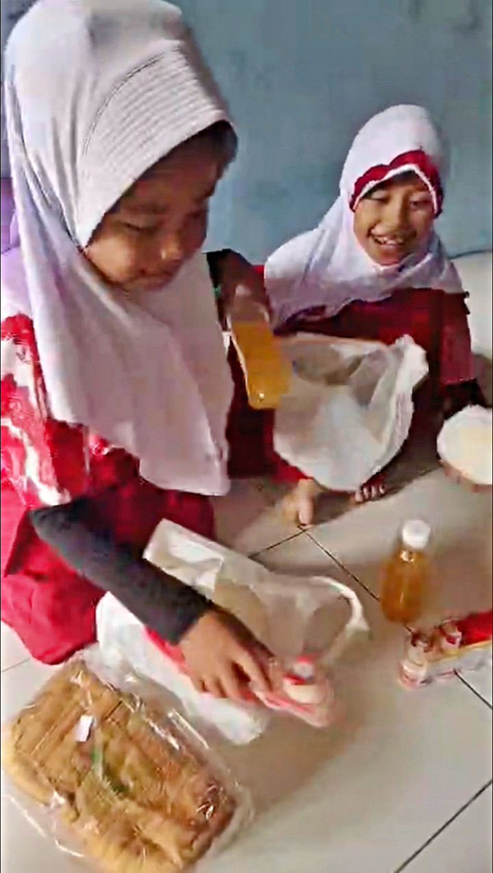 “Ini dapat apa lagi, masyaallah,” ujar sang ibu saat anak-anaknya mulai mengeluarkan isi paket. Seorang anak perempuan kemudian memperlihatkan isi kantong tersebut. “Roti..,” katanya sambil menunjukkan satu bungkus roti tawar. Tak lama, ia kembali menyebutkan isi lainnya dengan nada riang, “Dapat jus, dapat Yakult, sama dapat pir”.