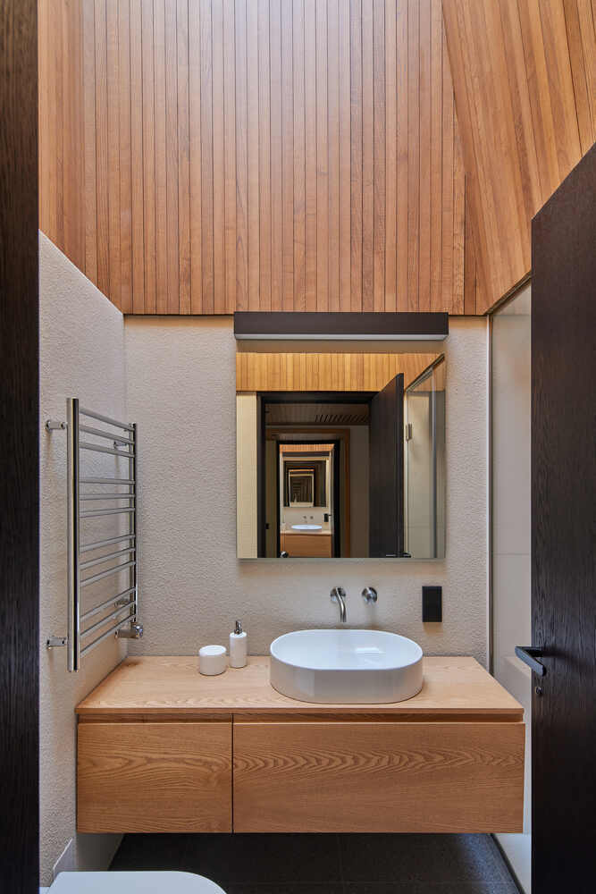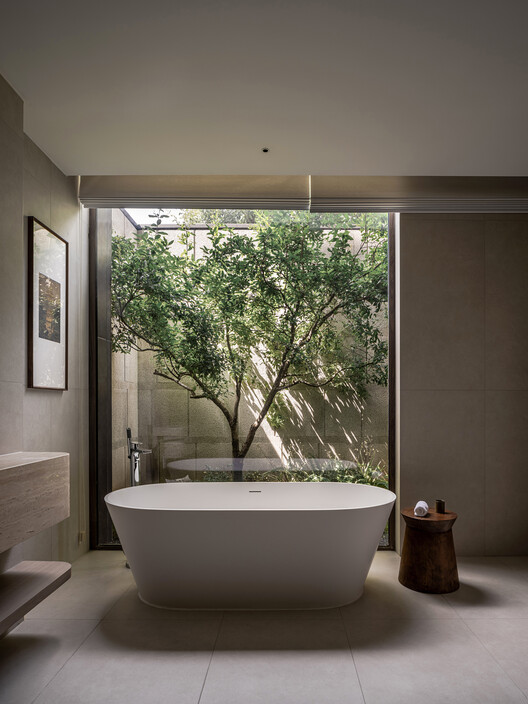 Desain kamar mandi hotel karya Montalba Architects ini hadir melalui dekorasi kontemporer yang menggunakan material kayu jati yang dipadukan dengan palet warna yang netral. -
