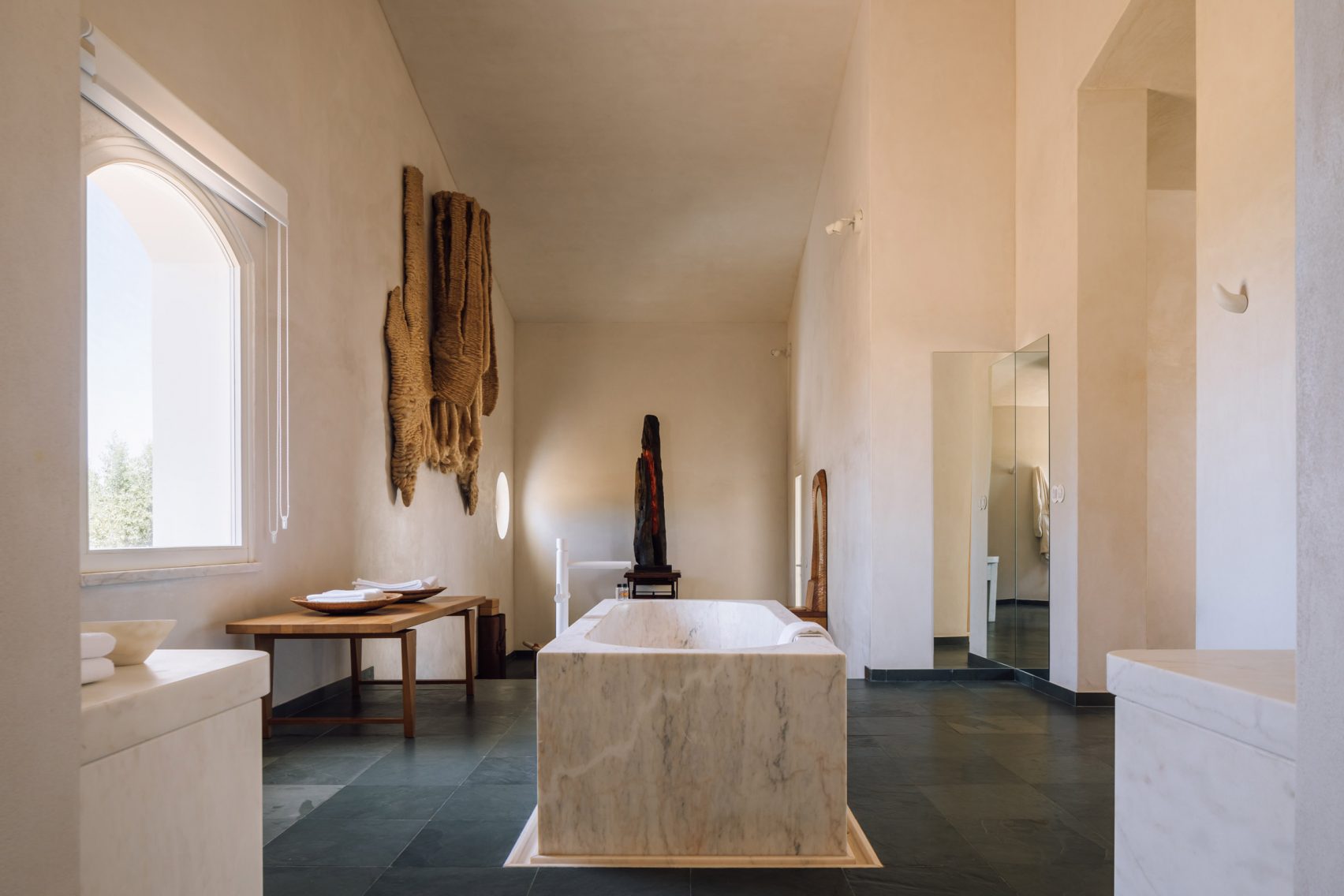 Karya Vitor Borges dan Franck Laigneau menghadirkan desain kamar mandi hotel dengan sentuhan halus dari material batu alam yang menjadi fokus visual desain kamar mandi hotel. -