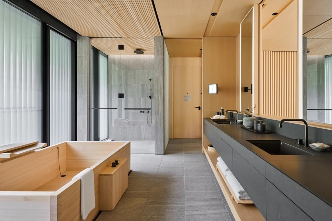 Salah satu karya Wilburban Architects. Desain kamar mandi hotel ini menawarkan pengalaman bersantai yang dikelilingi oleh pepohonan alam dan pegunungan melalui bukaan besar yang melengkung. -