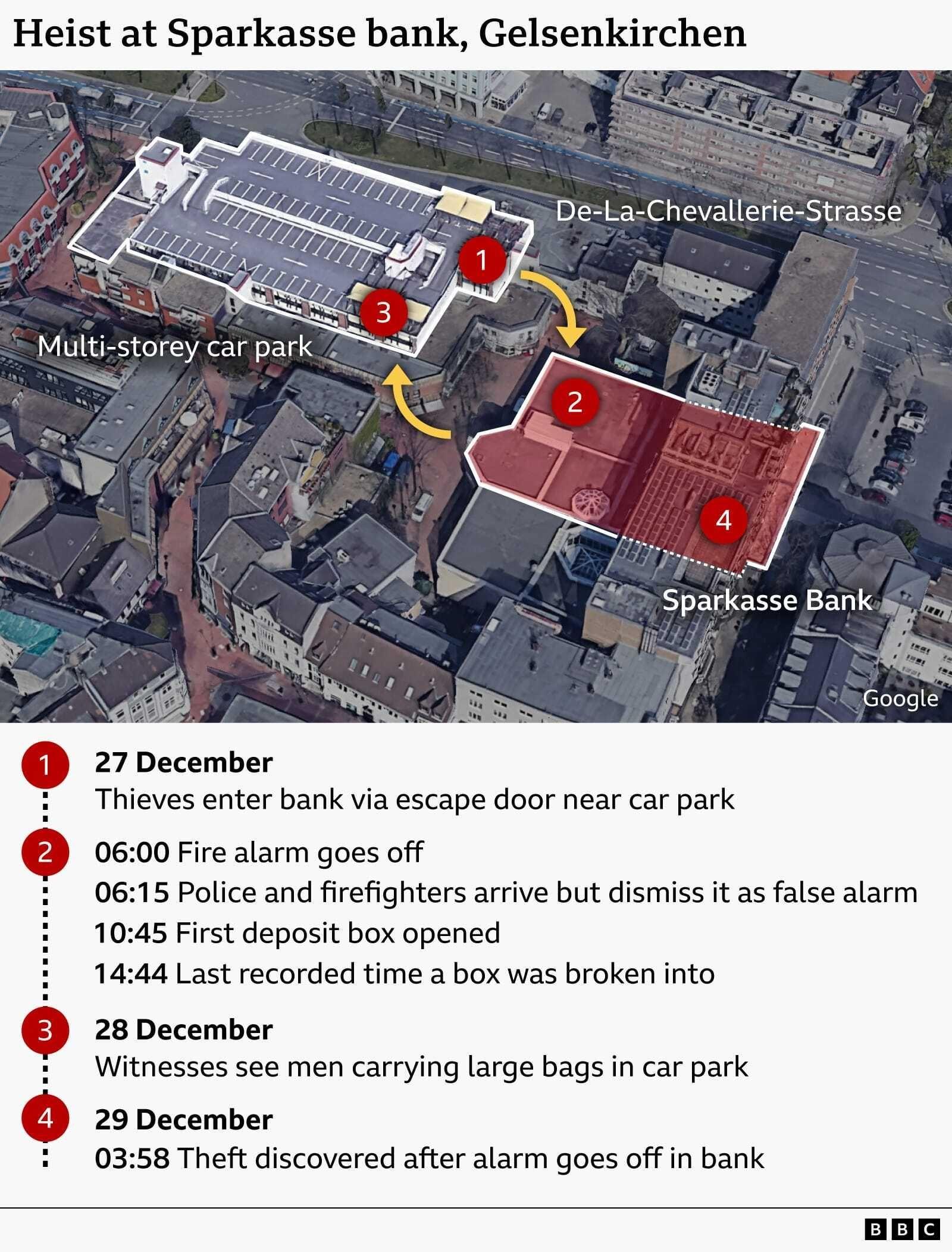 Kepolisian di Gelsenkirchen telah meminta masyarakat untuk memberikan kesaksian. Menurut penyelidik, para pencuri kemungkinan memasuki bangunan Bank Sparkasse di Nienhofstrasse melalui tempat parkir bertingkat yang lokasinya dekat. Mereka percaya bahwa pelaku mungkin telah merusak pintu keluar antara tempat parkir dan bank.