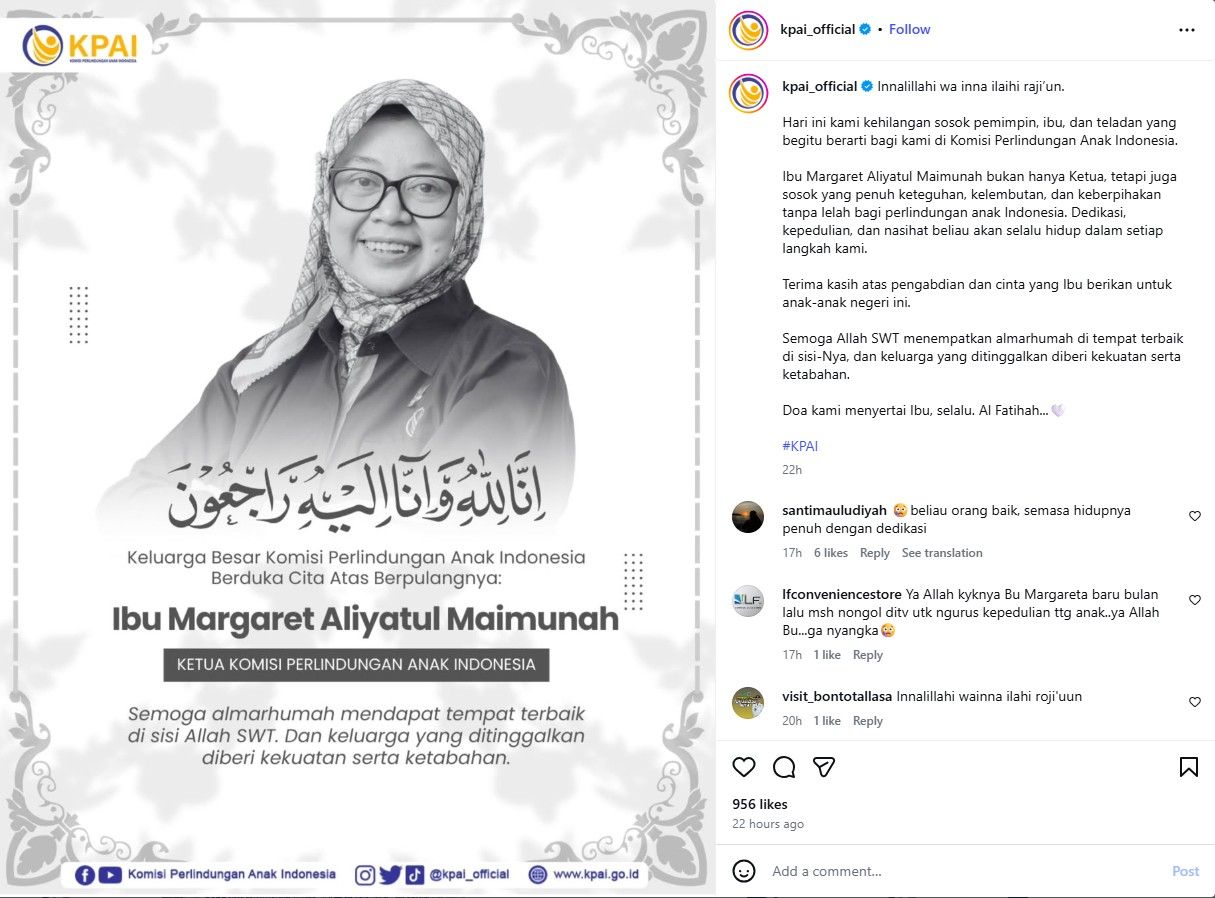 Kabar duka datang dari Ketua KPAI Margaret Aliyatul Maimunah. Ia telah berpulang di Rumah Sakit Fatmawati, Jakarta, pada Minggu (1/3/2026).