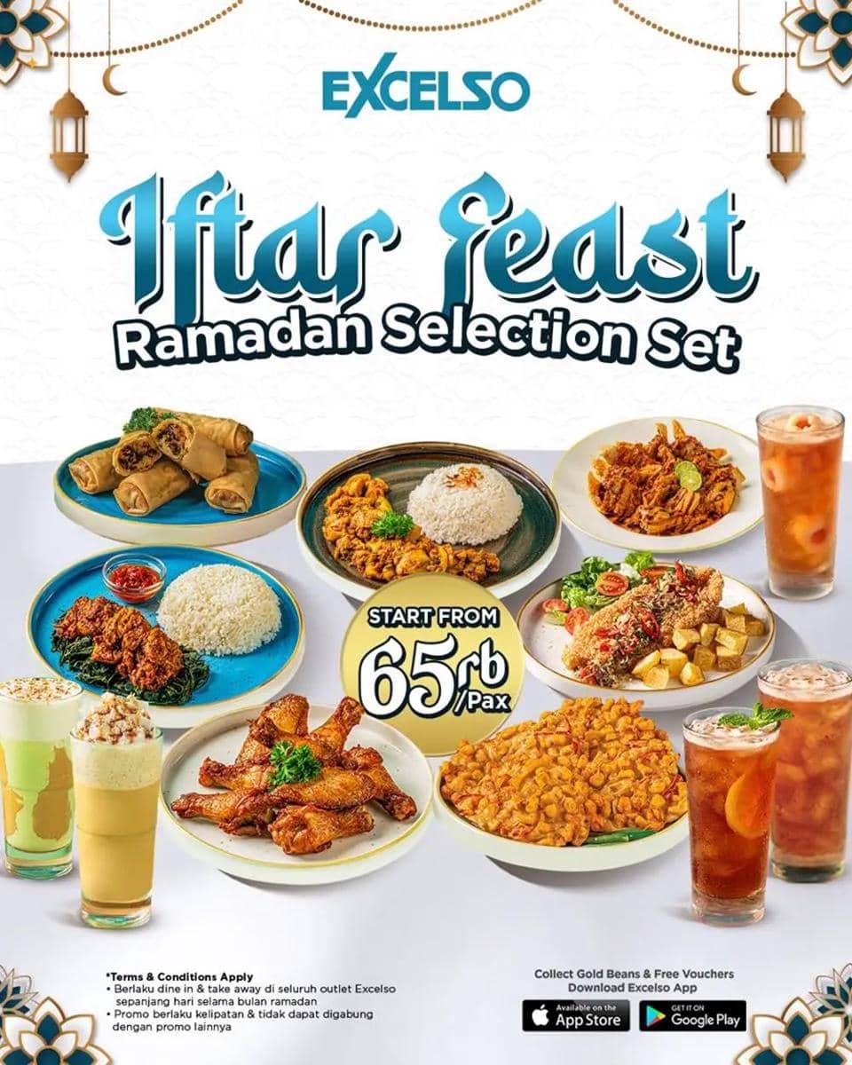Excelso Coffee menghadirkan promo Iftar Feast: Ramadan Selection Set yang cocok untuk buka puasa bersama orang tersayang. Tersedia tiga pilihan paket mulai dari Rp129 ribu hingga Rp399 ribu. Menu yang ditawarkan pun variatif, mulai dari Honey Chicken Wings, Ayam Woku, Dory Sambal Serah, hingga minuman seperti Kaloci Pandan Frappio. Paket ini dirancang untuk dua hingga empat orang sehingga pas untuk bukber kecil. Rasanya lengkap dari gurih hingga manis penutup yang memuaskan.