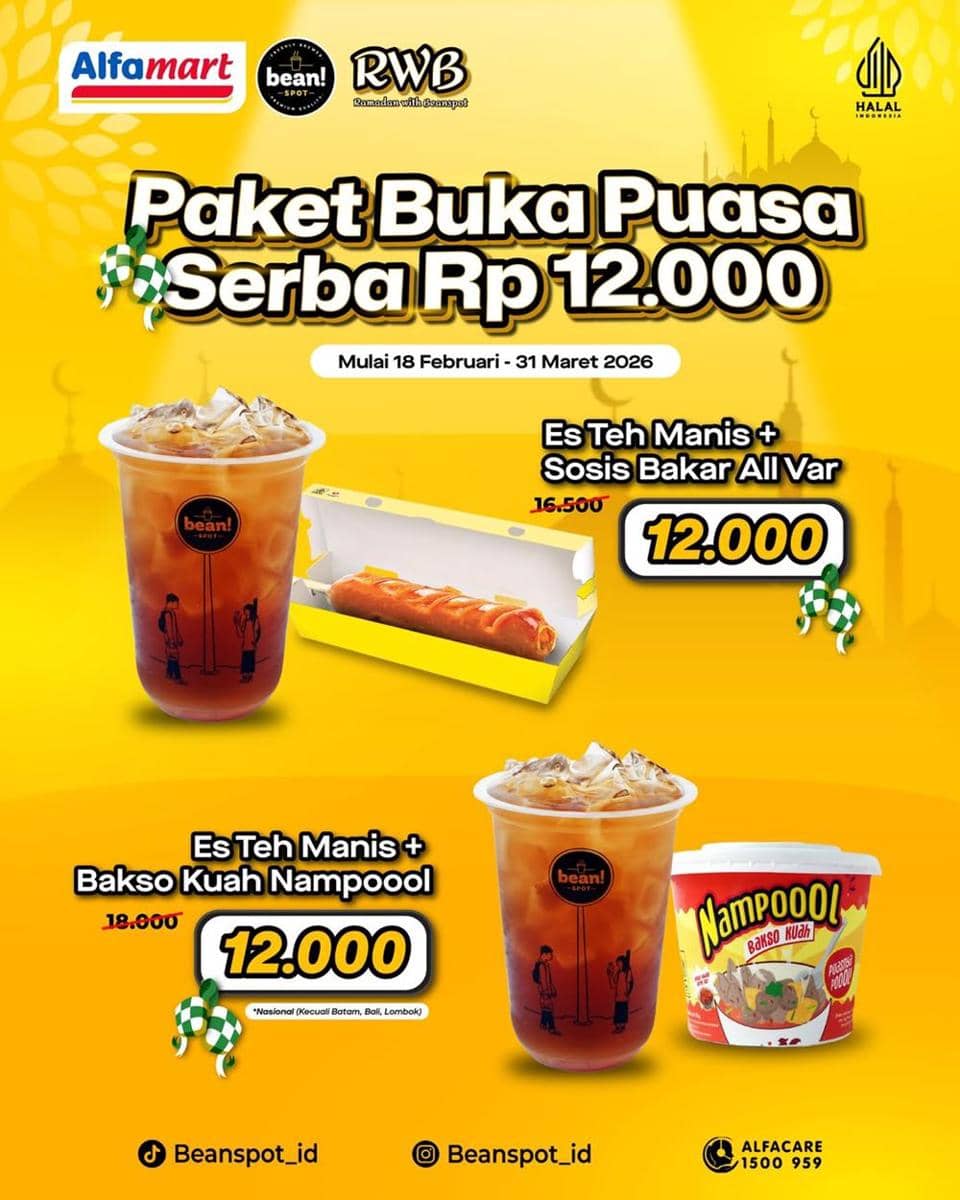 Promo ini berlaku mulai 18 Februari hingga 31 Maret 2026 dan bisa kamu nikmati di seluruh gerai Beanspot, kecuali Batam, Bali, dan Lombok. Dengan harga ramah di kantong dan pilihan menu yang pas untuk berbuka, Beanspot jadi opsi menarik buat kamu yang ingin bukber hemat tanpa ribet.