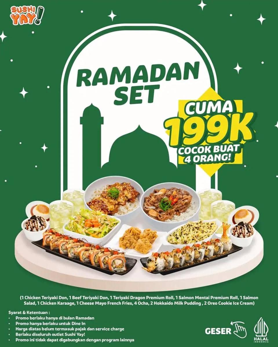 Sushi Yay! menghadirkan Ramadan Set seharga Rp199 ribu untuk empat orang. Menu yang ditawarkan lengkap mulai dari teriyaki don, premium roll, salad, hingga dessert. Ada juga promo AYCE Premium Buy 3 Get 4 khusus weekdays. Selain itu, tersedia promo AYCE hemat Rp79 ribu pada periode tertentu. Cocok untuk pencinta sushi yang ingin makan puas.
