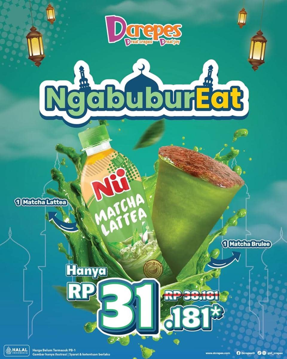 Buat kamu pecinta matcha, Dcrepes menghadirkan promo spesial Ramadan dengan harga Rp31 ribuan. Kamu bisa menikmati double matcha dalam satu pembelian, yaitu Matcha Brulee dan Matcha Lattea. Kombinasi rasa creamy dan manisnya pas banget untuk menu takjil. Tekstur crepes yang renyah berpadu dengan isian lembut bikin nagih. Cocok untuk kamu yang ingin berbuka dengan camilan ringan.