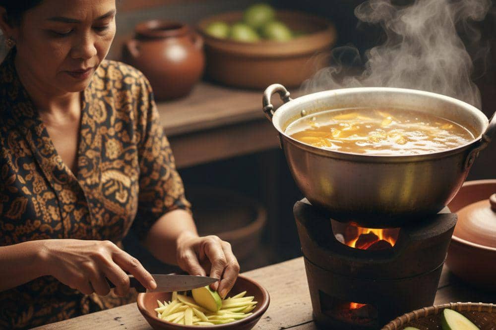 Mama bisa memperhatikan bahwa teknik mengiris buah yang sangat tipis ini sangat krusial karena tujuannya agar kuah ikan yang cair bisa meresap masuk ke setiap serat buah secara maksimal.