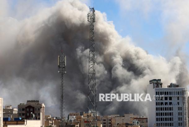 Asap mengepul di pusat kota Teheran setelah Israel kembali melancarkan serangan udara ke Iran, Ahad (1/3/2026). Operasi militer gabungan Israel dan AS berlanjut setelah sebelumnya menargetkan beberapa lokasi di seluruh Iran pada dini hari tanggal 28 Februari 2026. – (EPA/ABEDIN TAHERKENAREH)