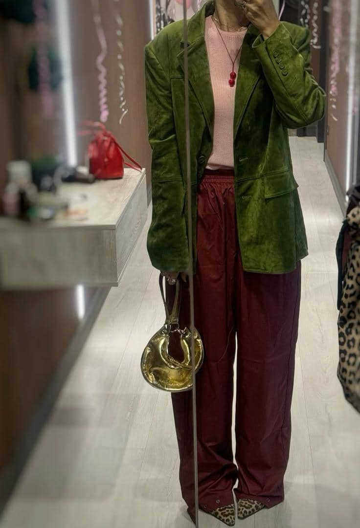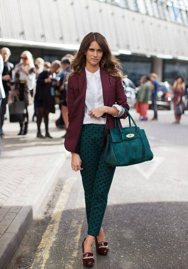 Selain hijau emerald dan sage, hijau army juga bisa memberi sentuhan bold saat disandingkan dengan burgundy. Perpaduan dua warna gelap ini menghasilkan nuansa elegan ketika dikenakan. Kamu bisa memakai celana burgundy dan padukan dengan blazer berwarna hijau army. Untuk inner-nya, pilihlah warna yang lembut seperti pink untuk menyeimbangkan perpaduan hijau dan burgundy yang kamu pakai.