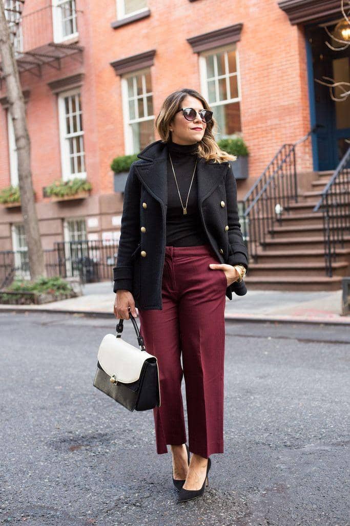 Jika ingin memakai warna burgundy untuk acara kasual, padukan saja item fashion warna burgundy milikmu dengan bawahan kulot khaki seperti di atas. Perpaduan keduanya terkesan sangat simpel dan elegan. Cocok dipakai untuk hang out santai atau acara kasual lainnya.