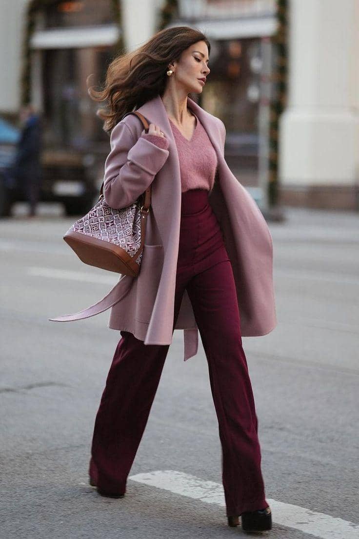 Warna baju soft purple jadi tampak sangat menarik saat dipadukan dengan bawahan celana burgundy. Kedua warna tersebut bisa memberikan tampilan feminin yang berkelas dan mewah. Apalagi jika dilengkapi dengan shoulder bag dan high heels sebagai aksesorinya.