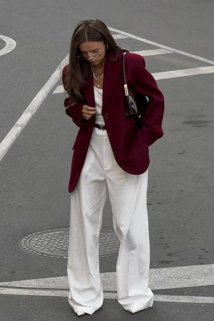 Warna burgundy cocok dengan warna apa lagi? Putih adalah pilihan yang aman lainnya. Nuansanya yang netral dan cerah akan membuat penampilan jadi kelihatan lebih formal. Namun, pilihlah warna putih yang broken white agar tidak terlalu terang saat dikenakan sebagai bawahan.